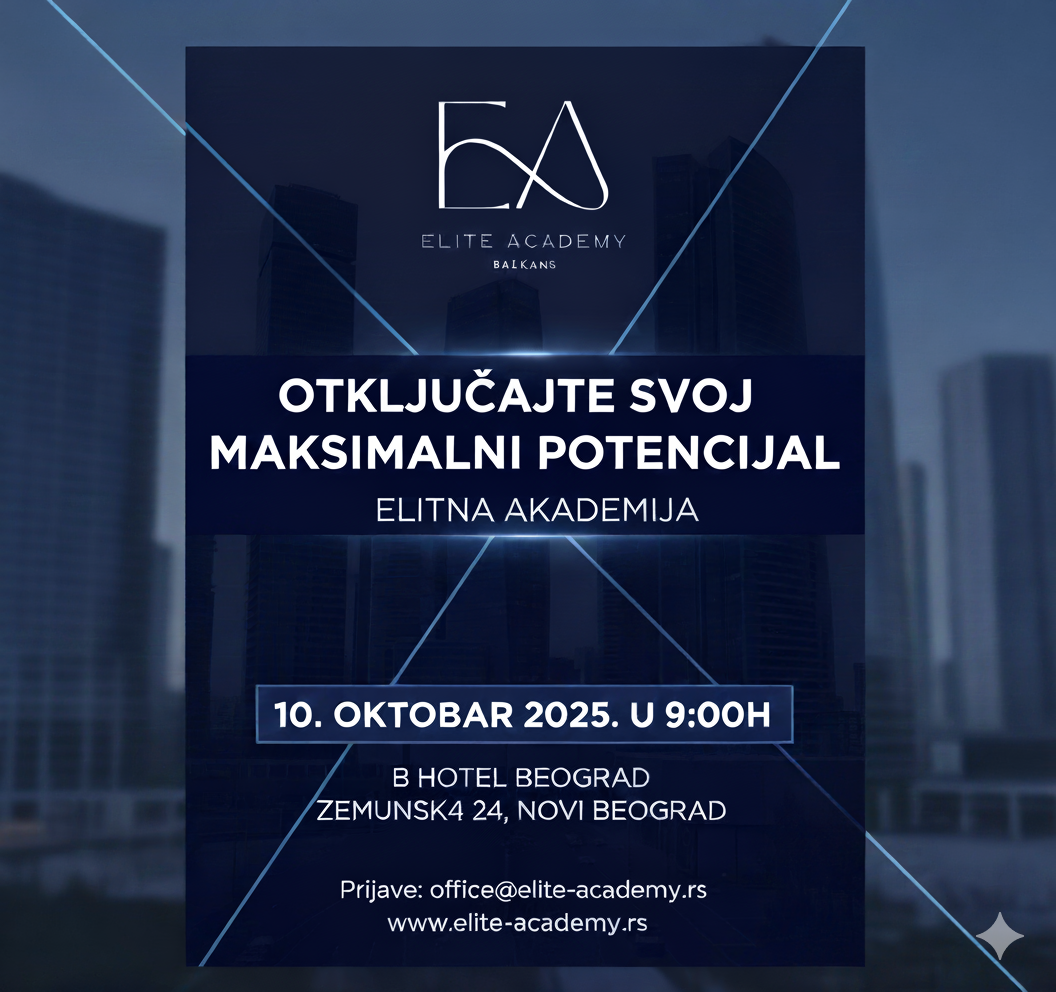 🚀 Otključajte Svoj Maksimalni Potencijal: Elitna Akademija - Advanced School Dolazi! 🚀 U svetu gde se granice pomeraju brzinom svetlosti, a inovacija je ključ opstanka i napretka, važno je ne samo pratiti trendove već ih i stvarati. Elite Academy Balkans sa ponosom najavljuje početak programa koji će redefinisati vašu lidersku viziju i katapultirati vas ka vrhunskom uspehu: Elitna Akademija...